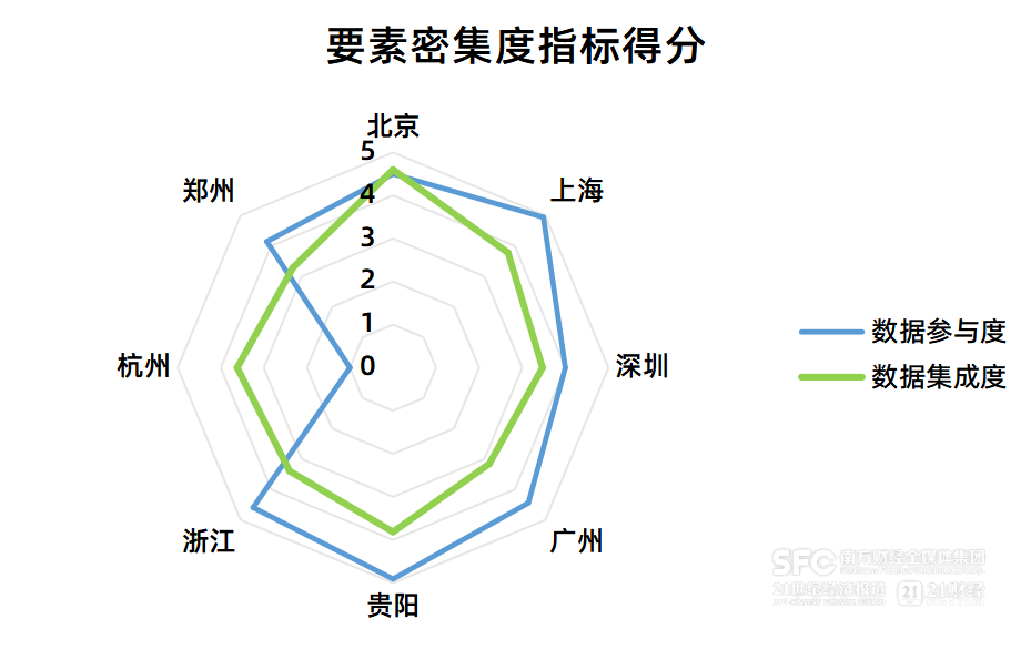本月,在“要素密集度”的两项细分指标中,各数据交易机构的“数据参与度”得分除杭州外,整体保持较高水平,多集中于4-5分之间,上海得分最高为4.94。而杭州的“数据参与度”得分出现跳水,至最低分1分。从数据产品类型来看,“数据参与度”得分较高的产品类型主要集中于数据集、数据API、dataSet等数据资源,相关产品上架数量达169个,占比超过四成。相较之下,“数据集成度”整体得分较为平稳,多集中于3.5-4分之间,平均值为3.85。北京、深圳、上海、贵阳等地数据交易机构得分上升,反映出本月上架的数据产品综合性较高、类型较为丰富;而郑州、杭州、广州等部分机构的“数据集成度”得分下降,其中郑州下降幅度较大,广州、郑州得分明显低于均值。